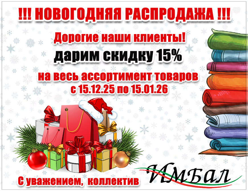 Уважаемые клиенты, у нас стартует НОВОГОДНЯЯ РАСПРОДАЖА!!! В преддверии главного праздника, дарим вам скидку 15% на весь ассортимент товаров (акция проходит с 15.12.25 до 15.01.26 вкл)
