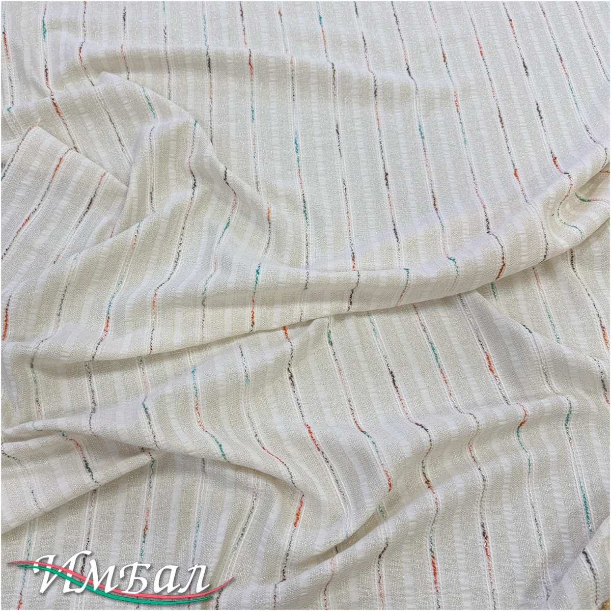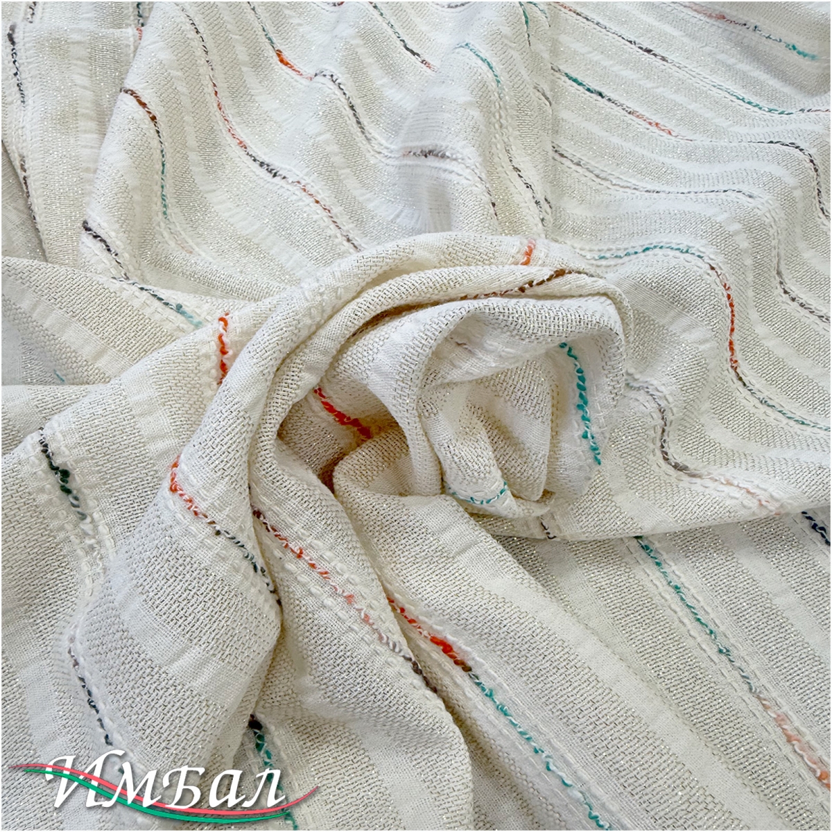 Хлопок со льном фактурный вышитые оранжево-бирюзовые полосы на ванильном фоне