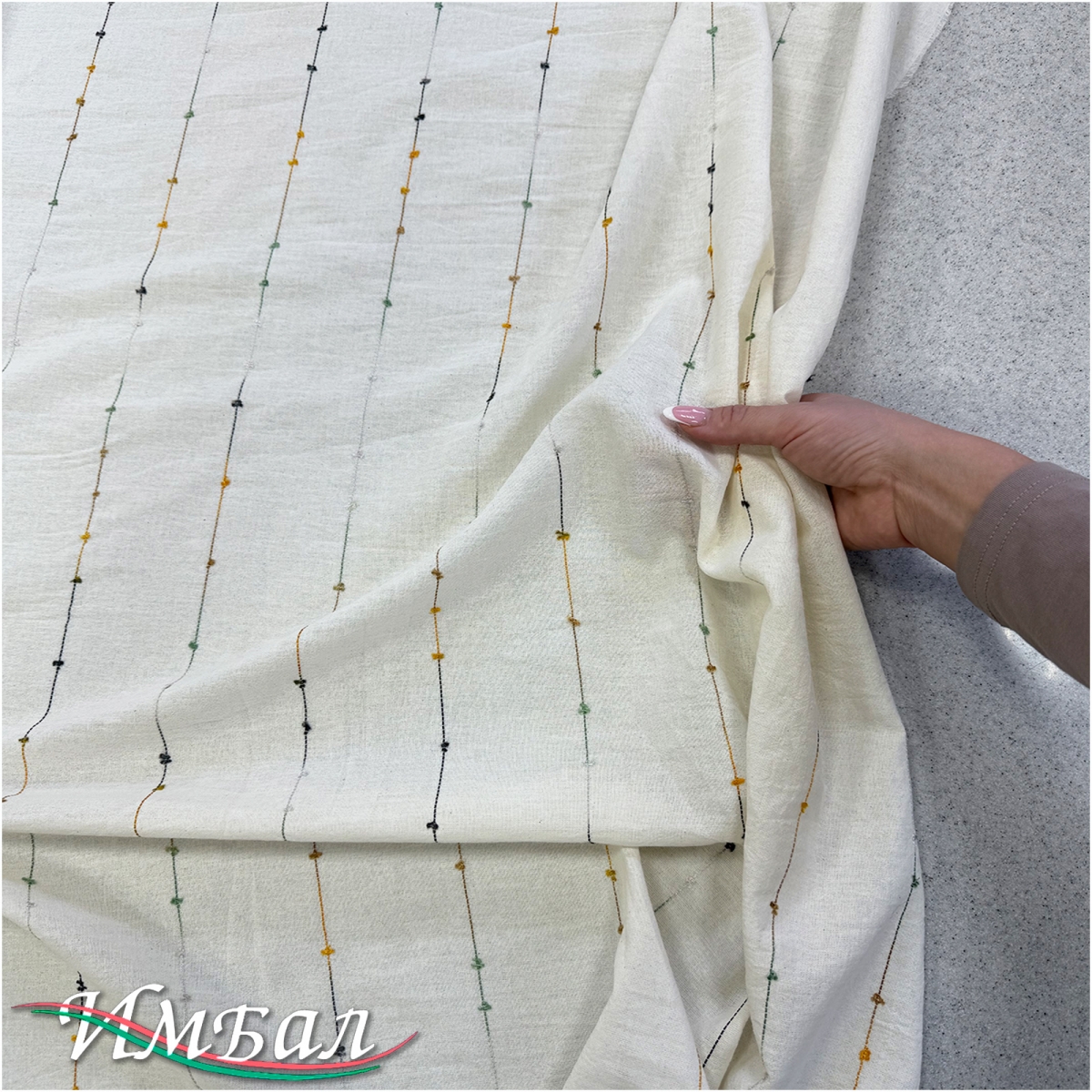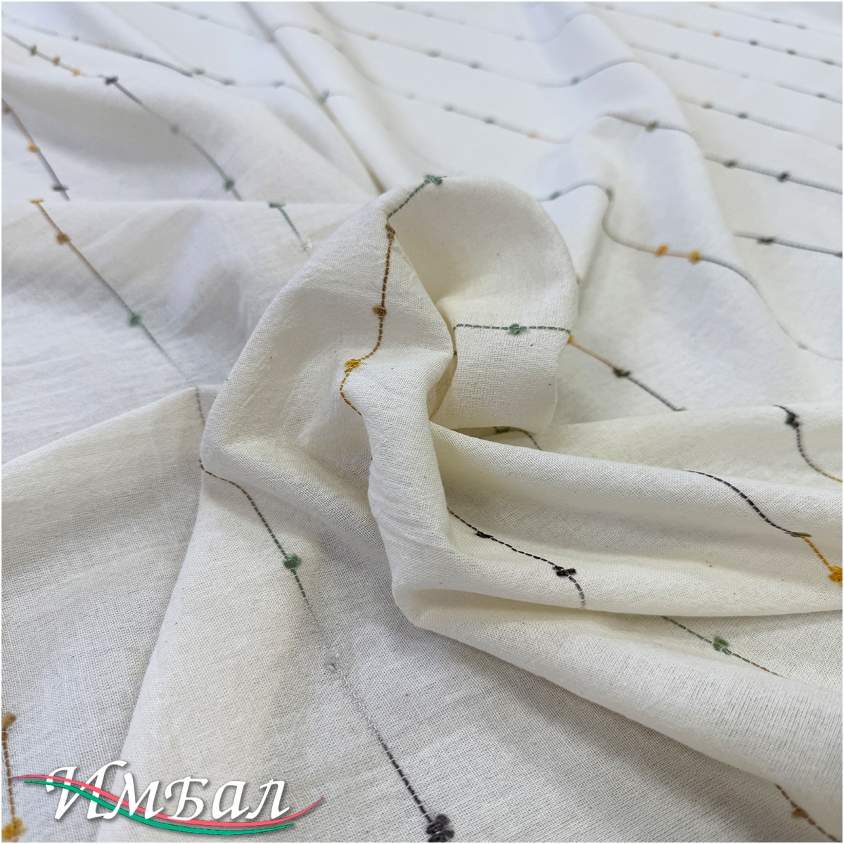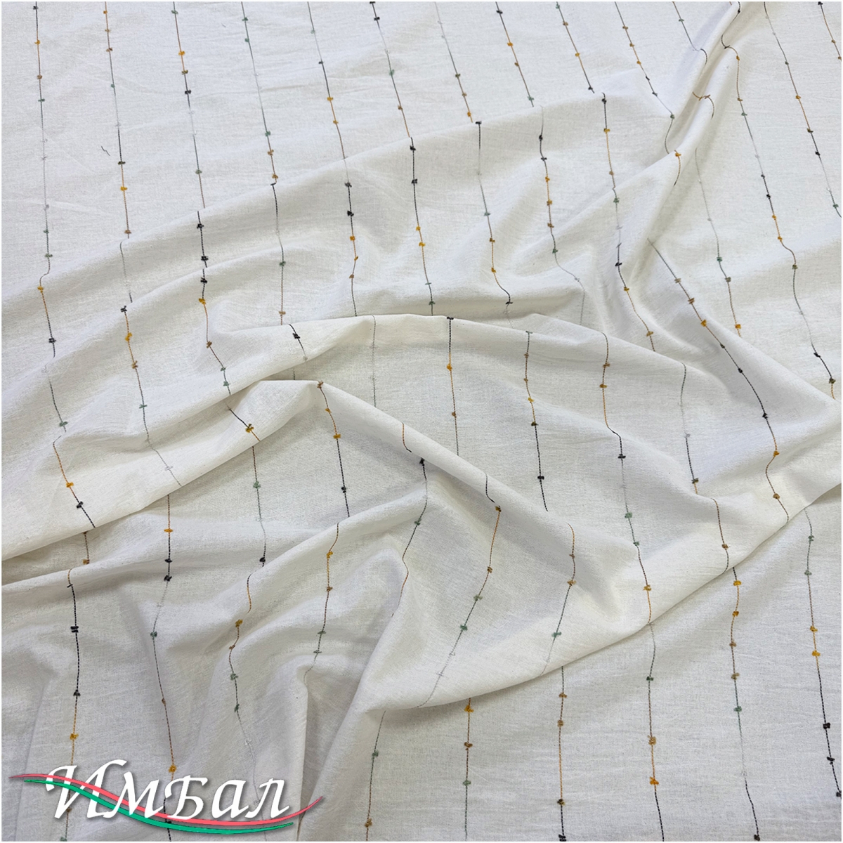 Хлопок со льном фактурный вышитые разноцветные полосы на ванильном фоне