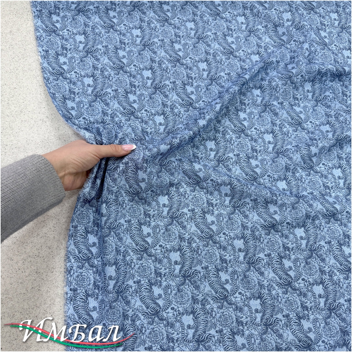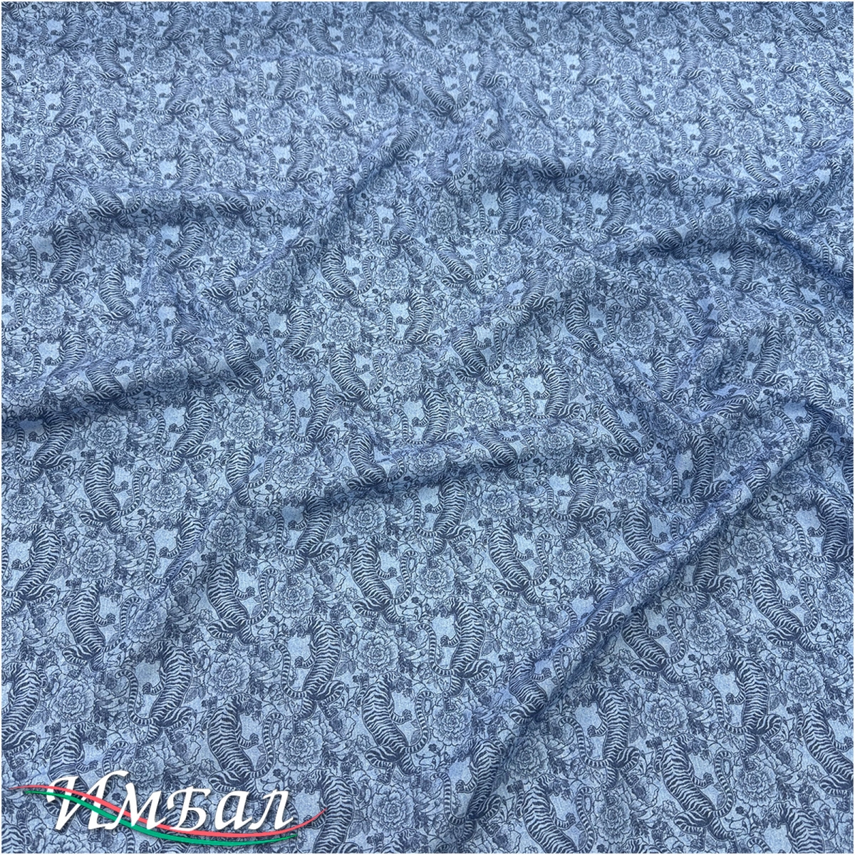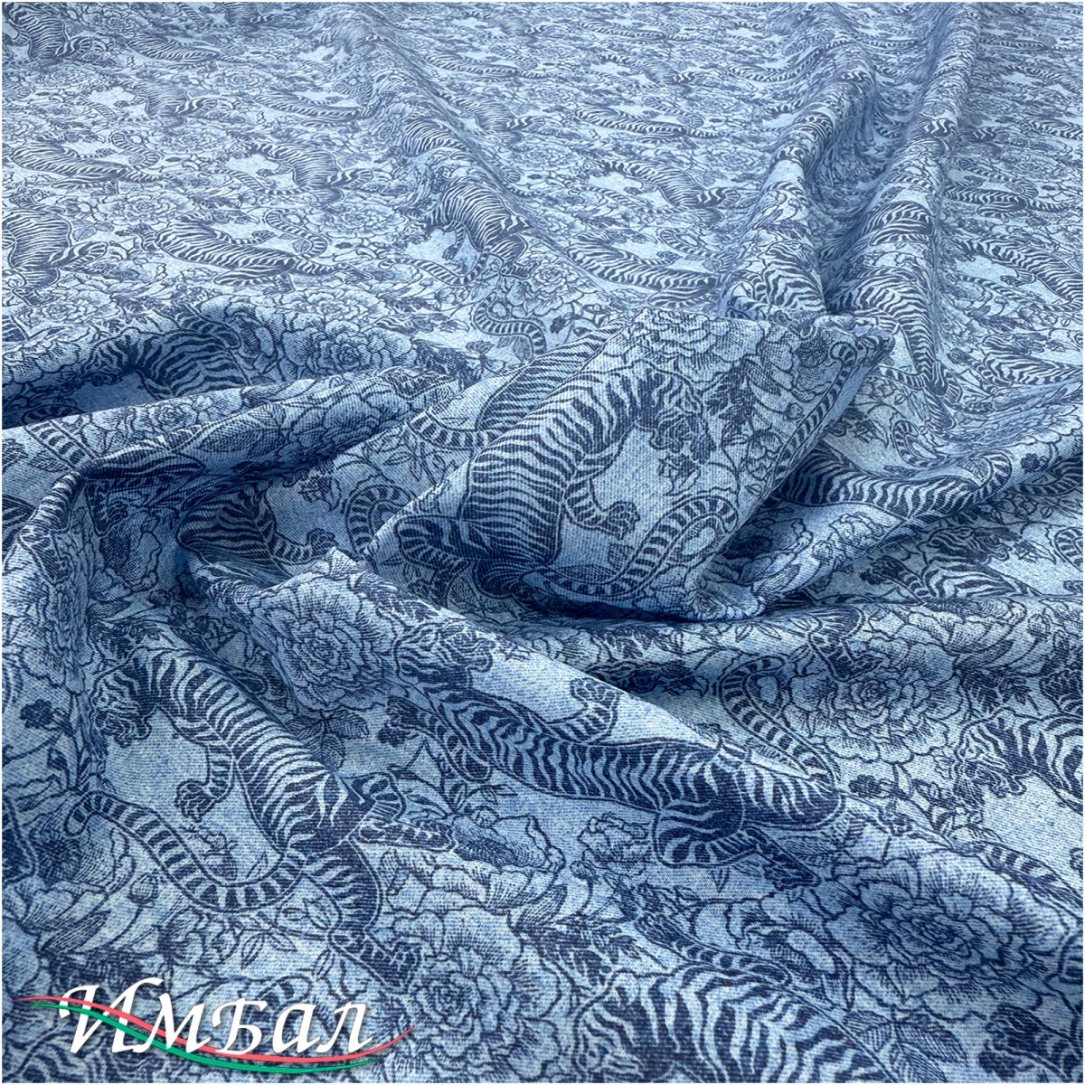 Хлопок стрейч плательно-рубашечный принт Giamba цветы и тигры на джинсово-синем фоне