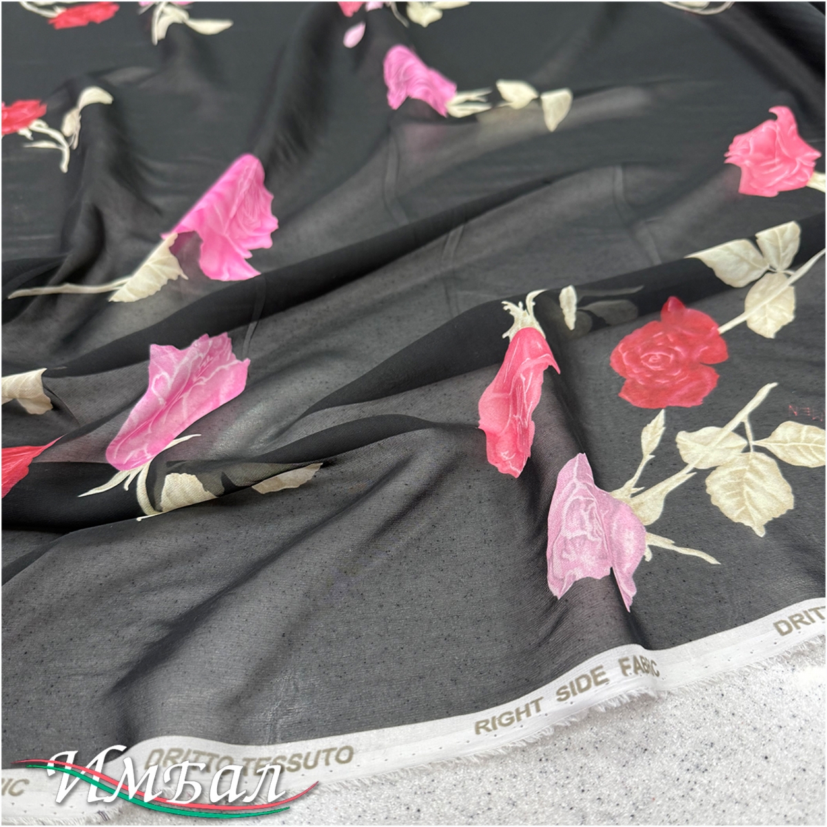 Шелк шифон дизайн AMEN розы на черном фоне