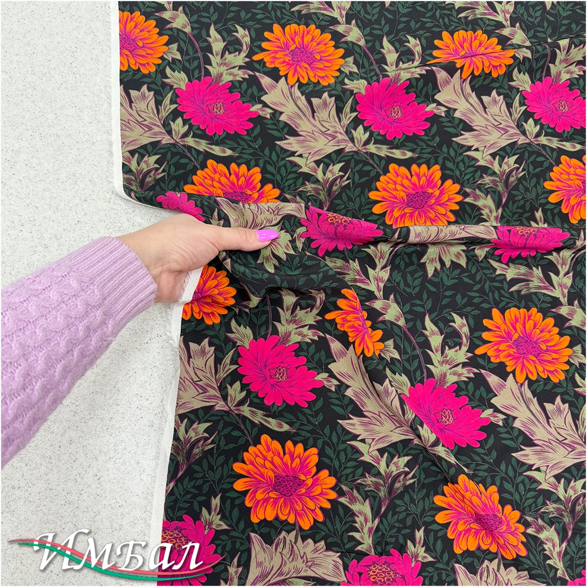Шелк стрейч крепдешин дизайн Kenzo розово-оранжевые пионы на черном фоне