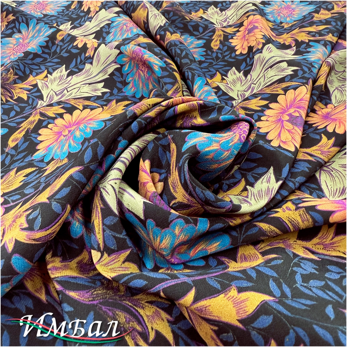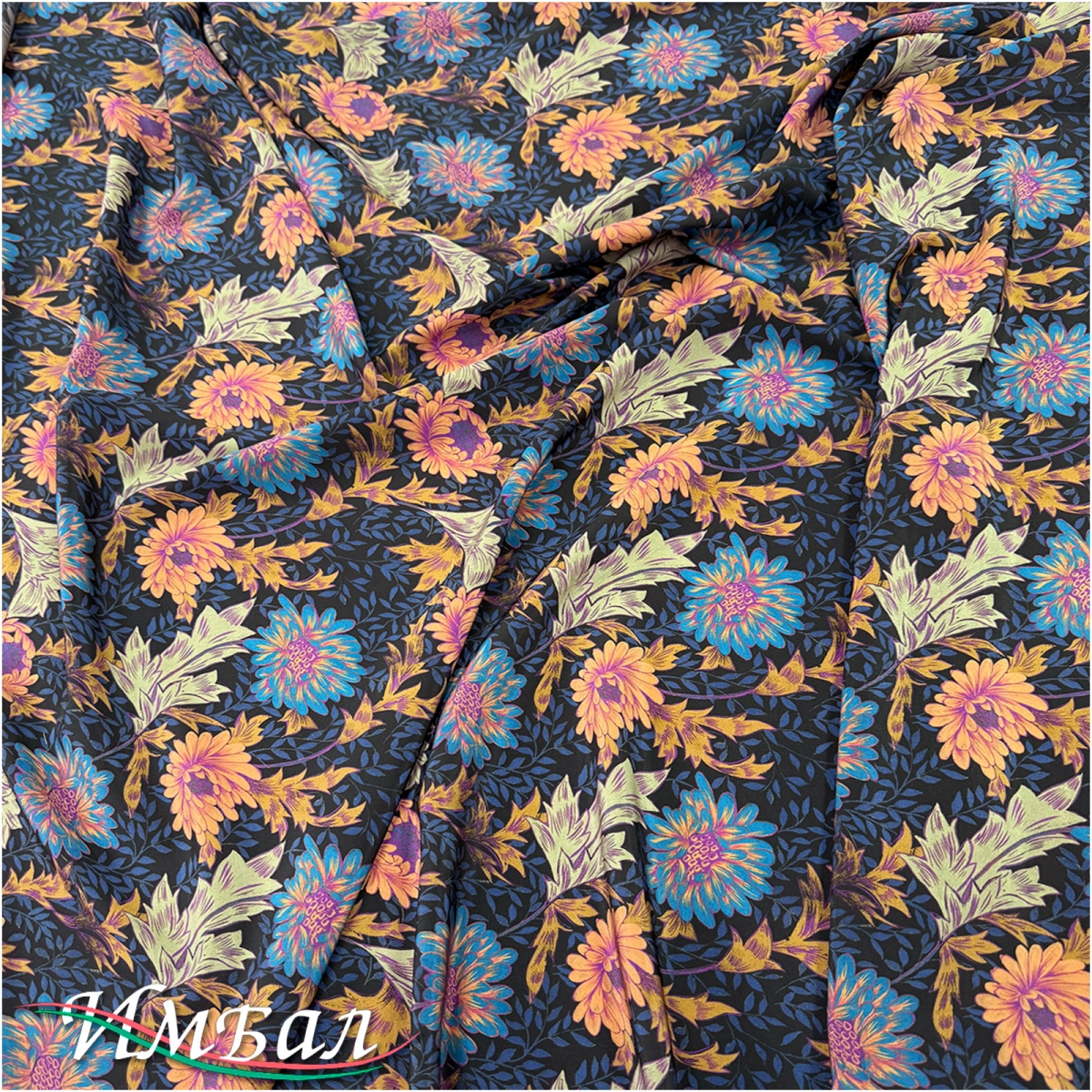 Шелк стрейч крепдешин дизайн Kenzo сине-охристые пионы на черном фоне