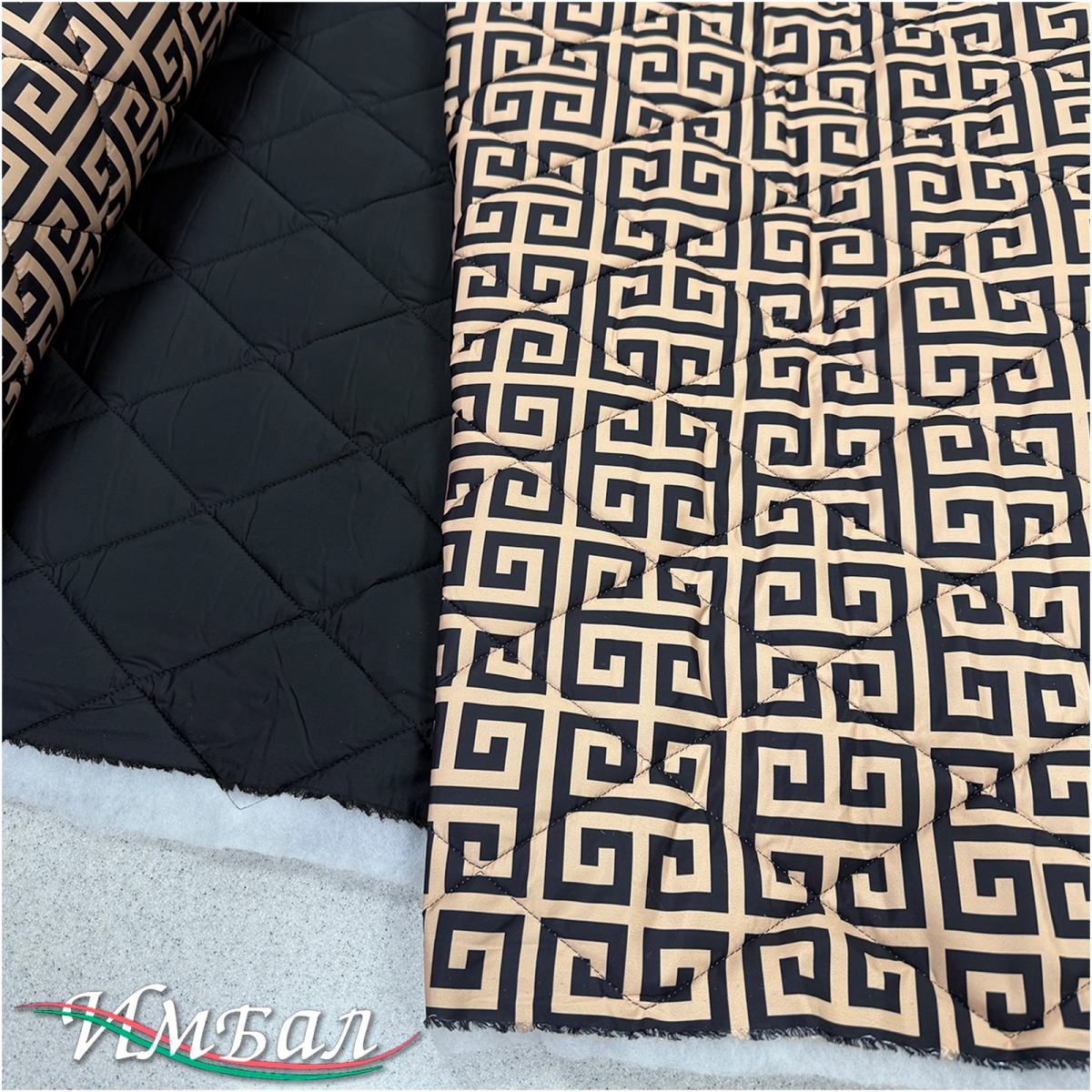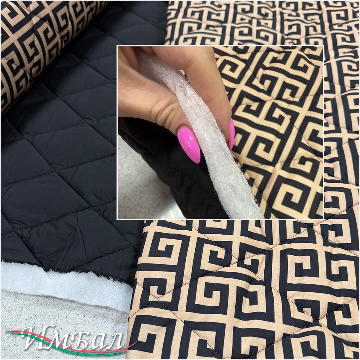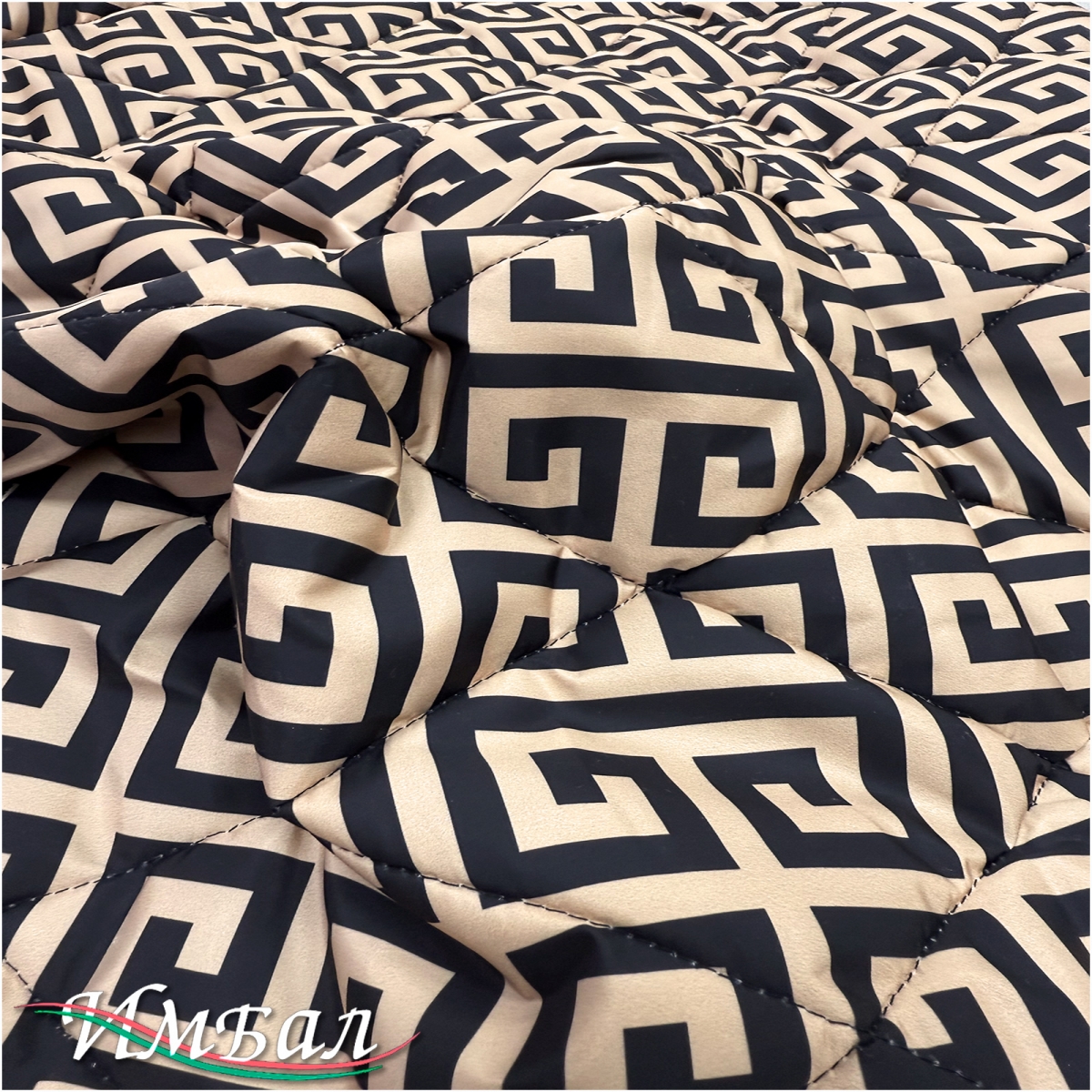 Ткань курточная стеганная дизайн GUCCI с черными логотипами на бежевом фоне