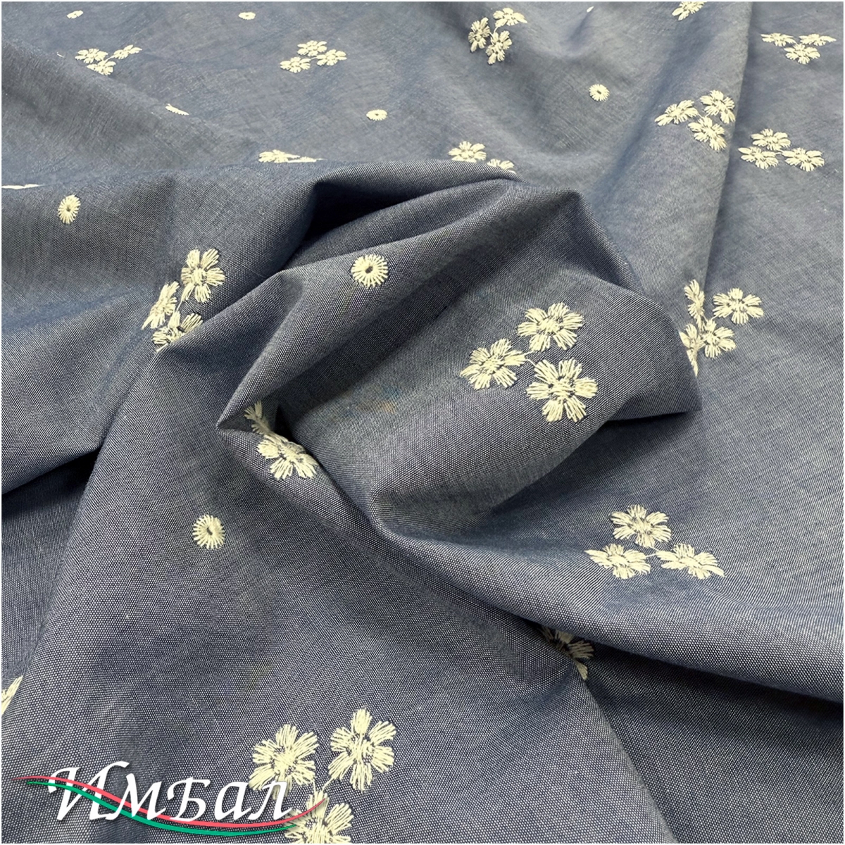 Ткань рубашечная хлопок со льном Blumarine вышивка на серо-голубом фоне