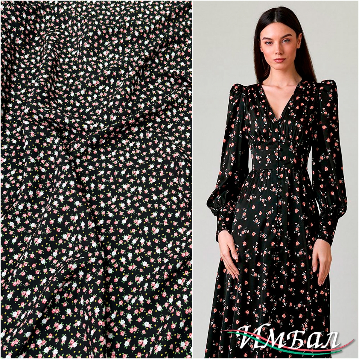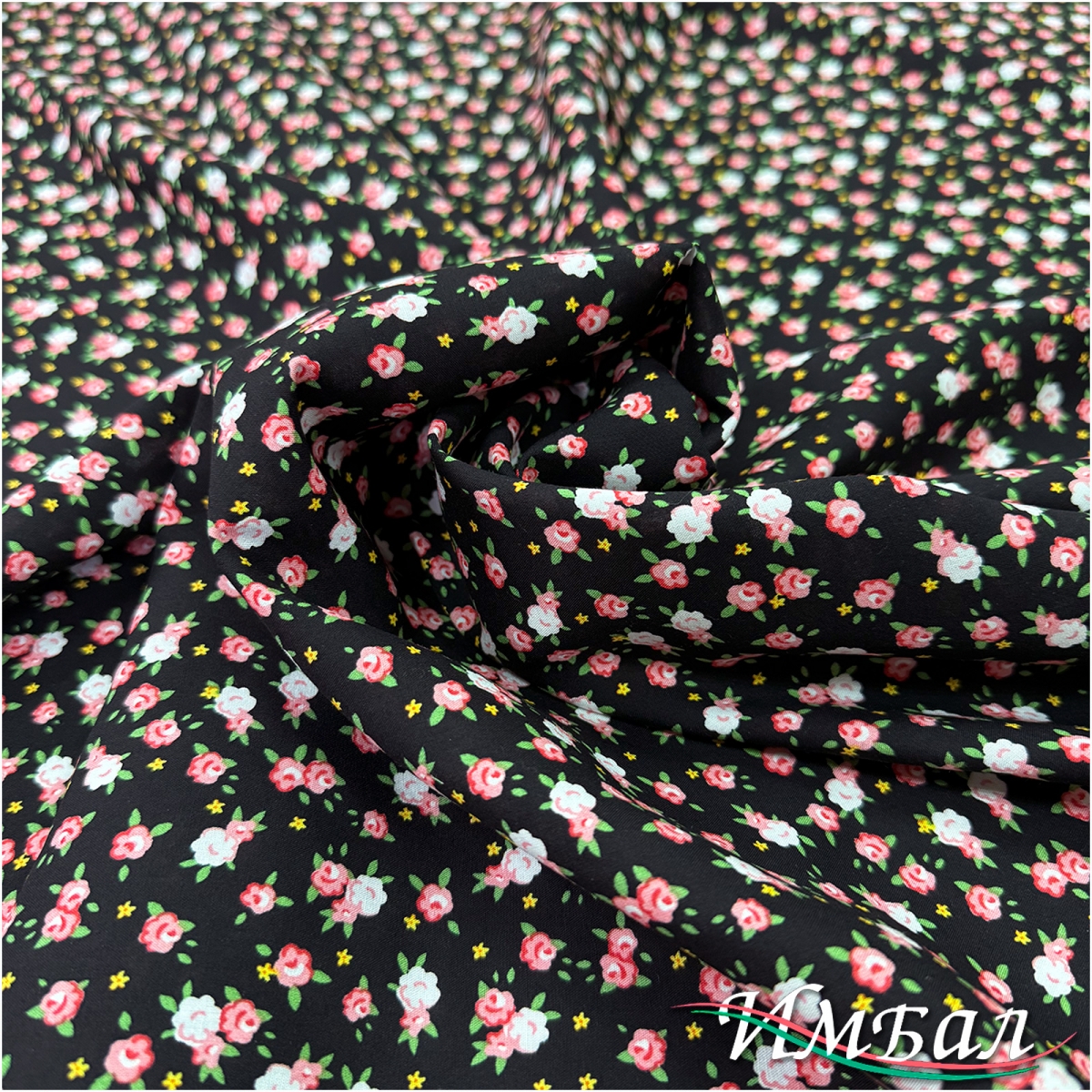 Вискоза плательная принт бабушкин сундук мелкие розочки на черном фоне
