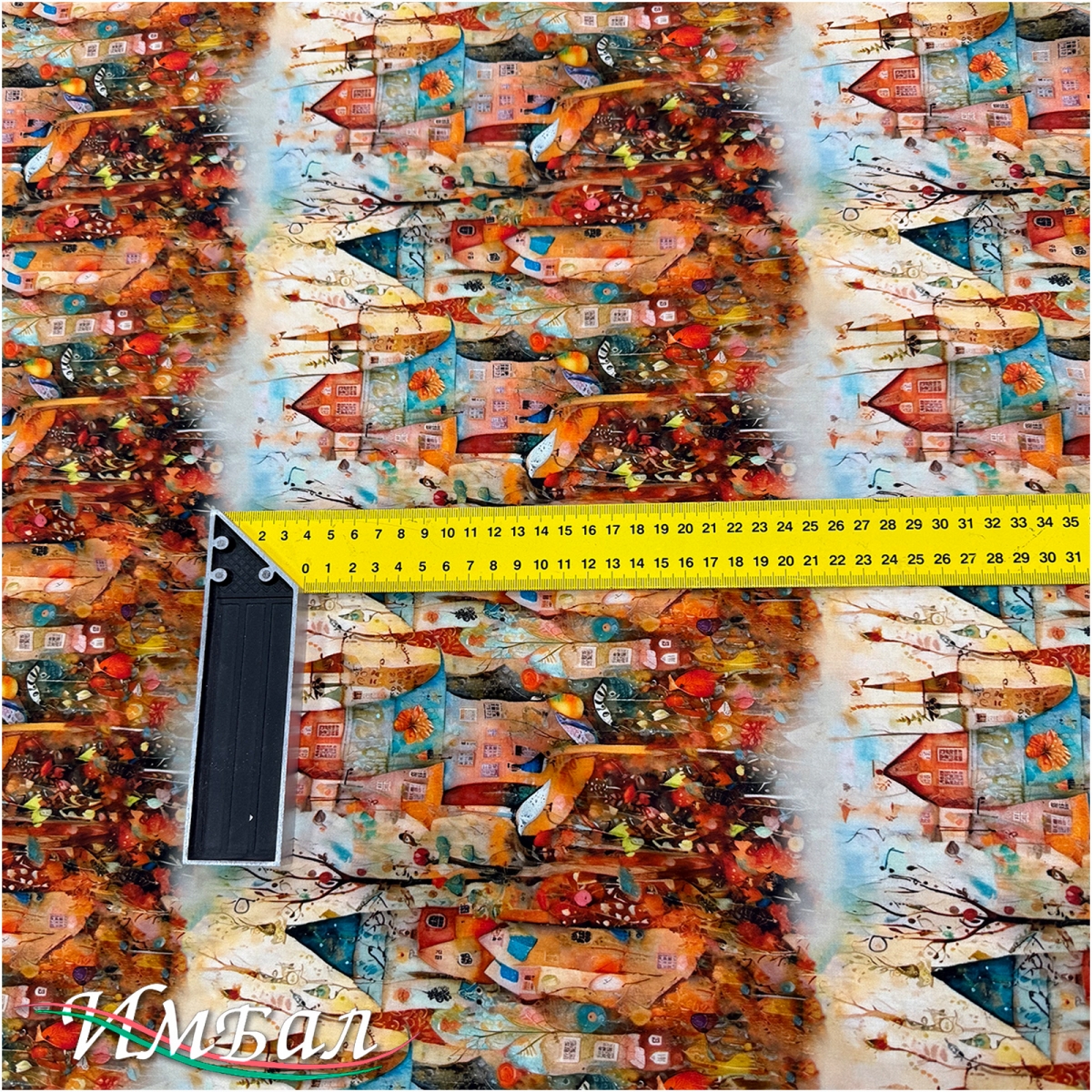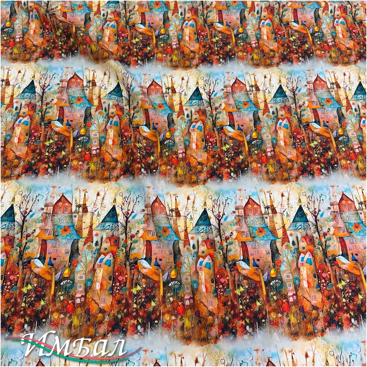 Вискоза плательная струящаяся дизайн готические домики в коралловых тонах