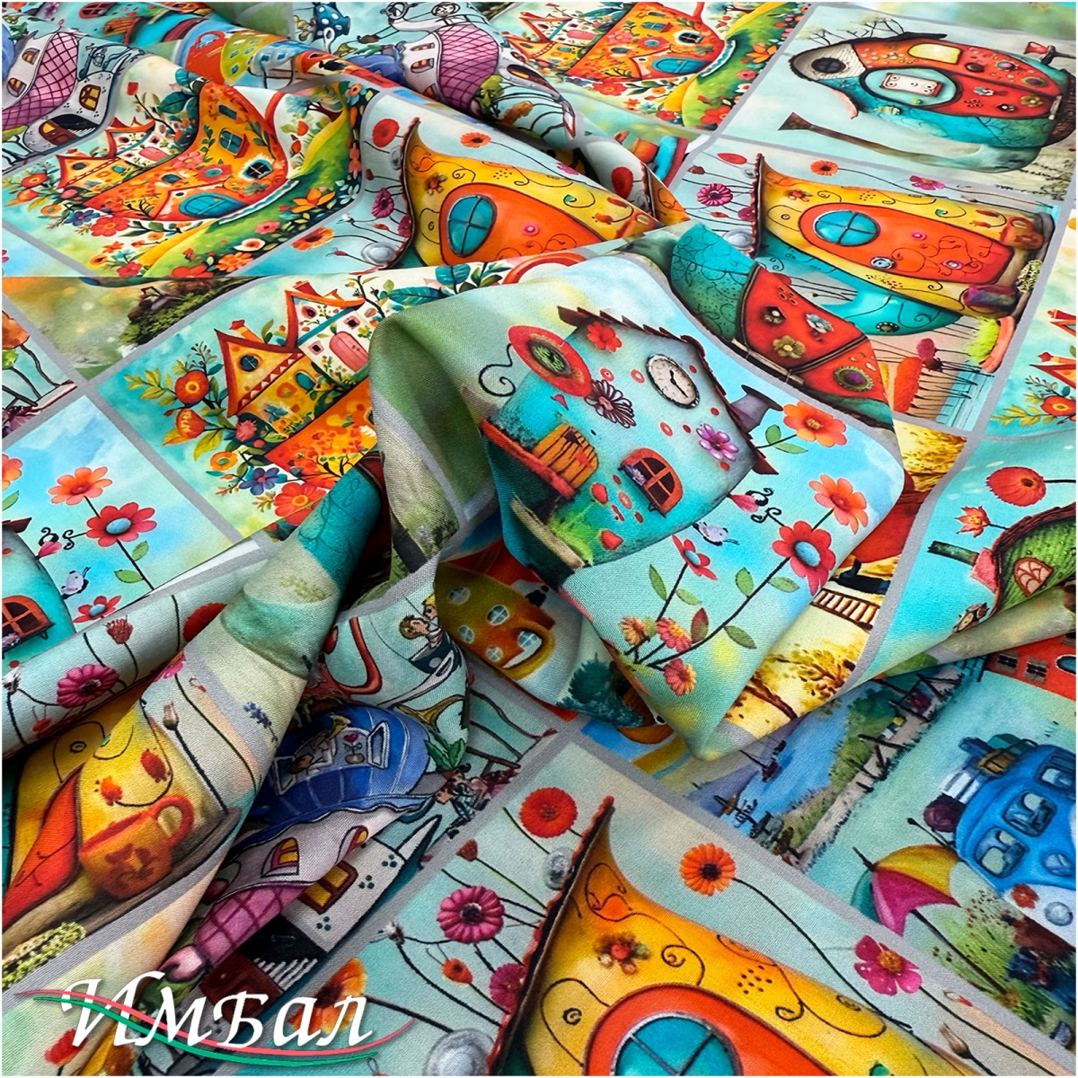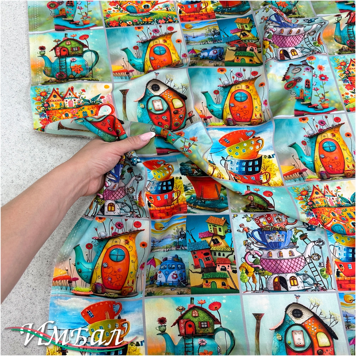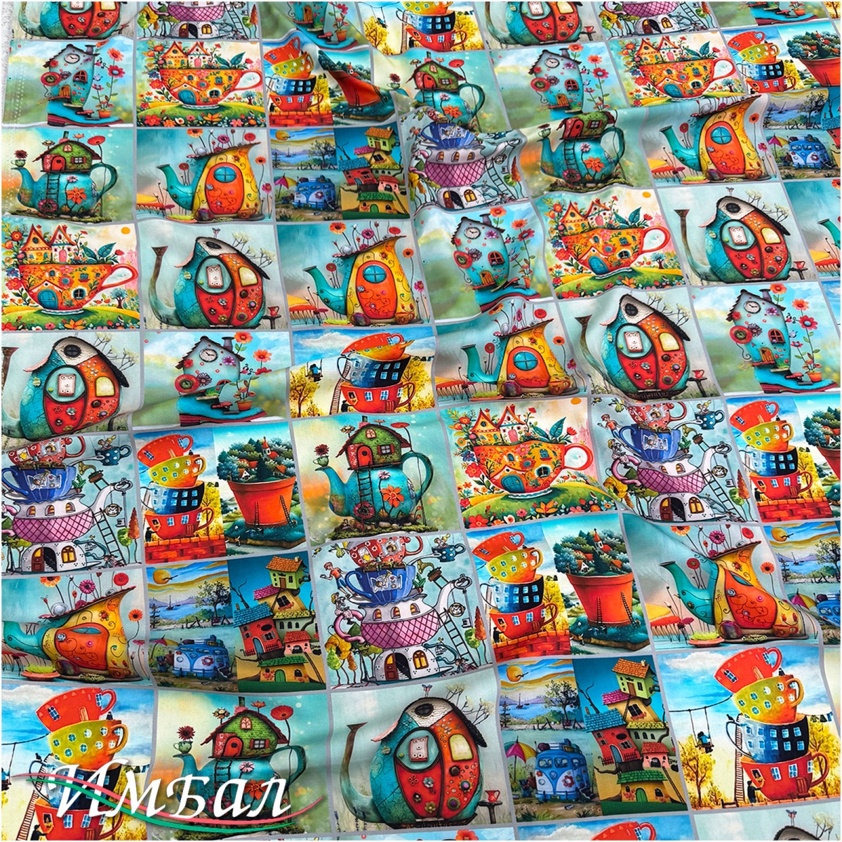 Вискоза плательная струящаяся дизайн пэчворк со сказочными чайниками