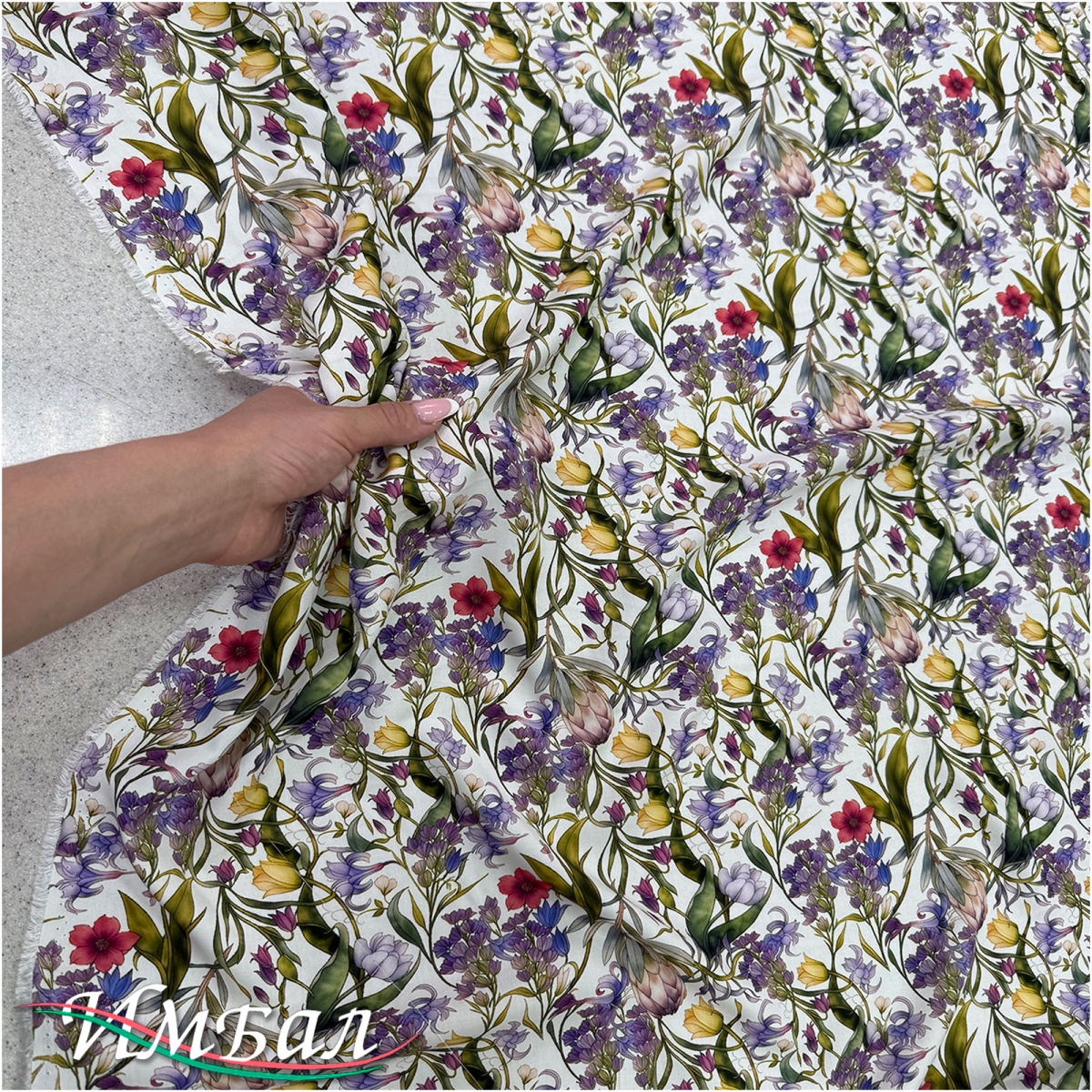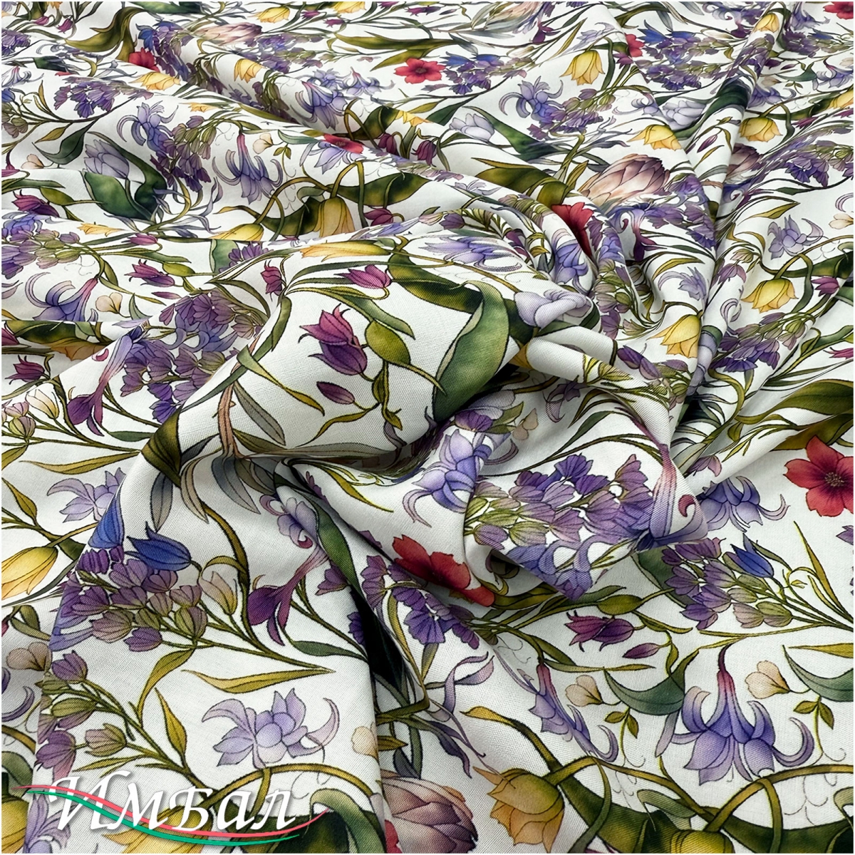 Вискоза плательная струящаяся дизайн полевые сиреневые цветы на молочном фоне