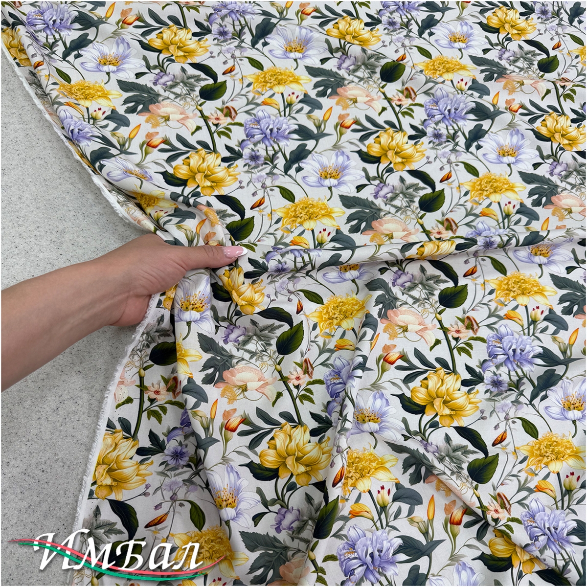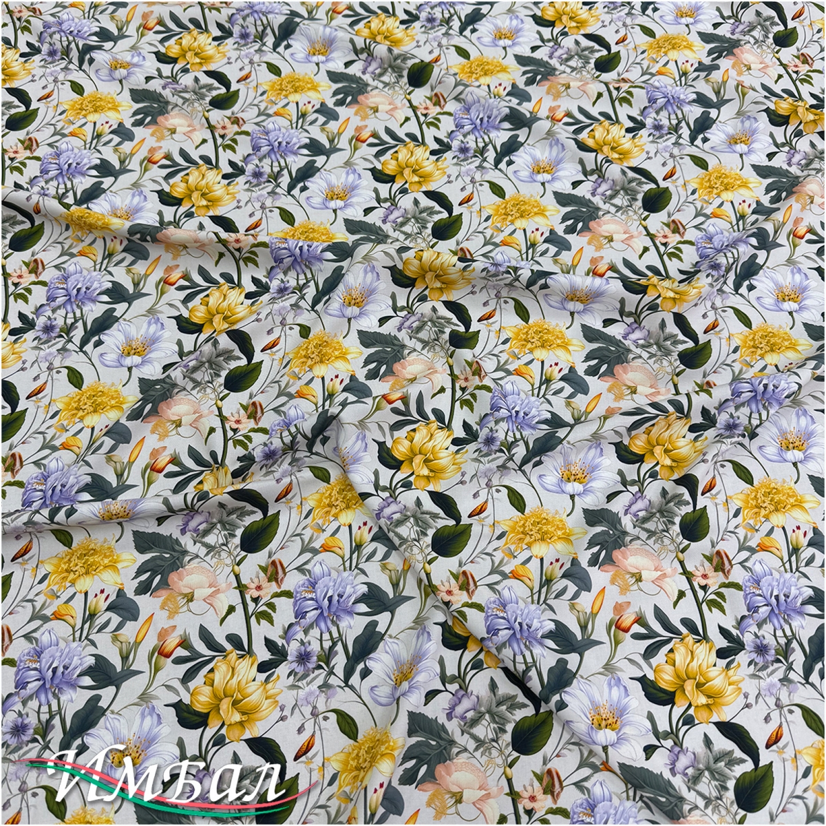 Вискоза плательная струящаяся дизайн желто-сиреневые полевые цветы на молочном фоне