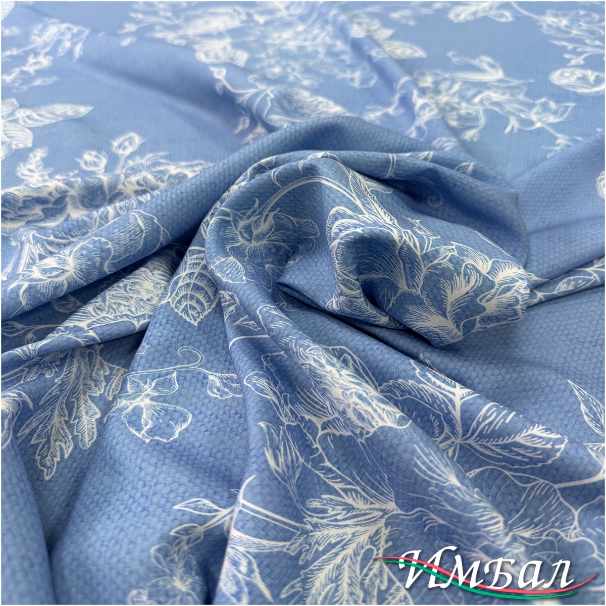 Вискоза плательная струящаяся принт абстрактные белые букеты на нежно-голубом фоне